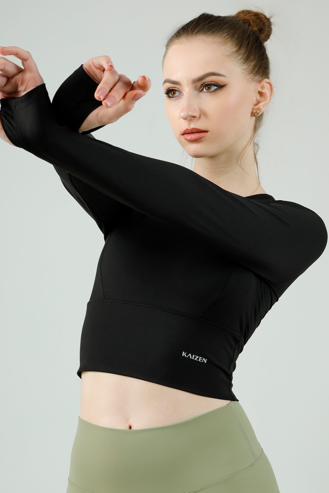 Elevate your activewear with the Cut-Out Long Sleeve Crop Top. This sleek, top features stylish cut-out details near the neckline, adding a modern and edgy vibe to your workout look. The fitted design offers a cropped length ensures comfort and mobility. Perfect for yoga, running, or casual wear, this top is made from premium moisture-wicking fabric that keeps you cool and dry. Thumbhole sleeves provide added functionality and style. Pair it with high-waisted leggings for a chic and functional ensemble or wear it casual with jeans.
