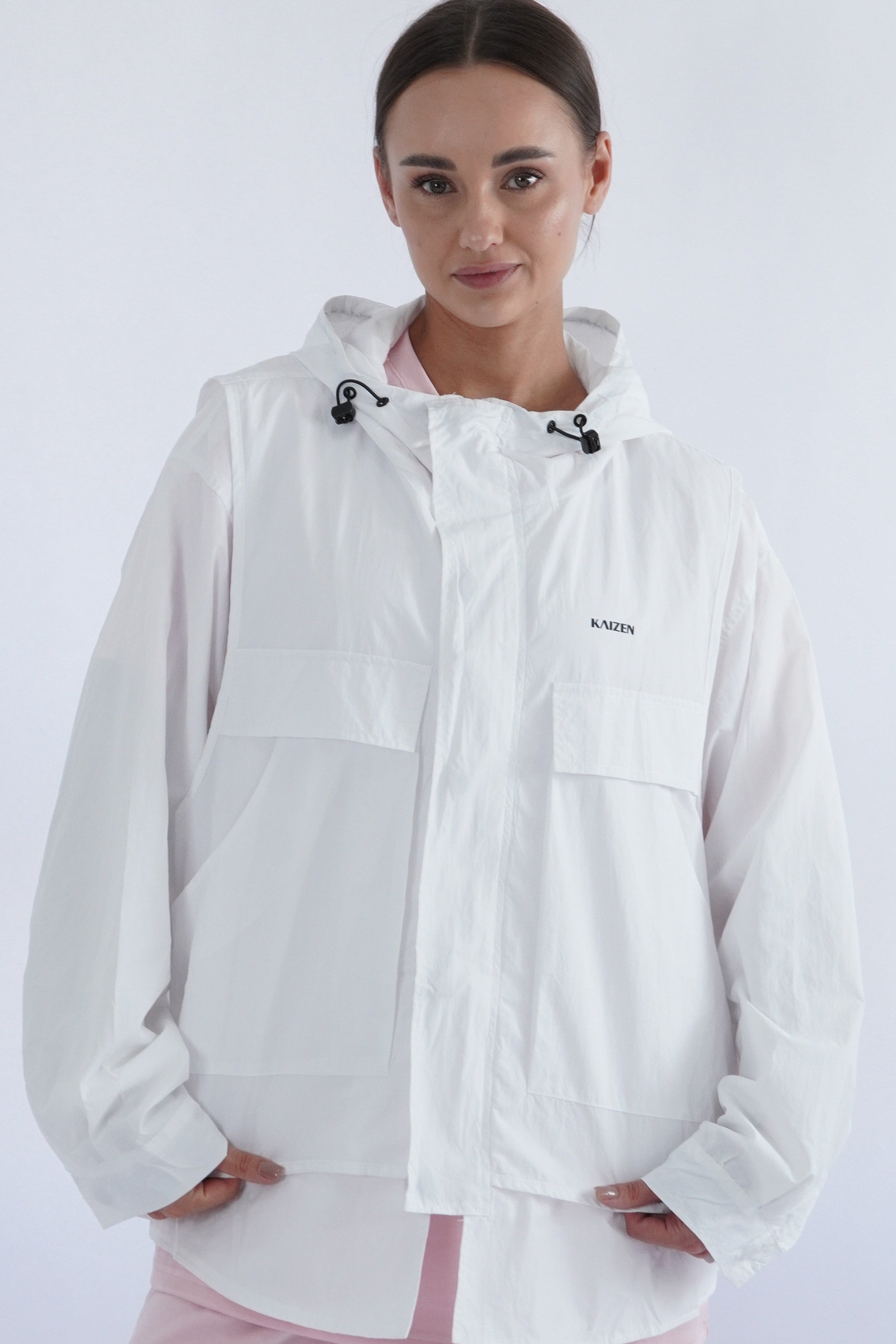 Stay light, stay ready — it’s your ultimate outerwear essential for on-the-move days. Designed with a relaxed, oversized style, this windbreaker features functional flap pockets, adjustable toggles, and a protective hood. Crafted from lightweight, water-repellent fabric, it layers effortlessly over your activewear or casual outfits without compromising breathability or style.